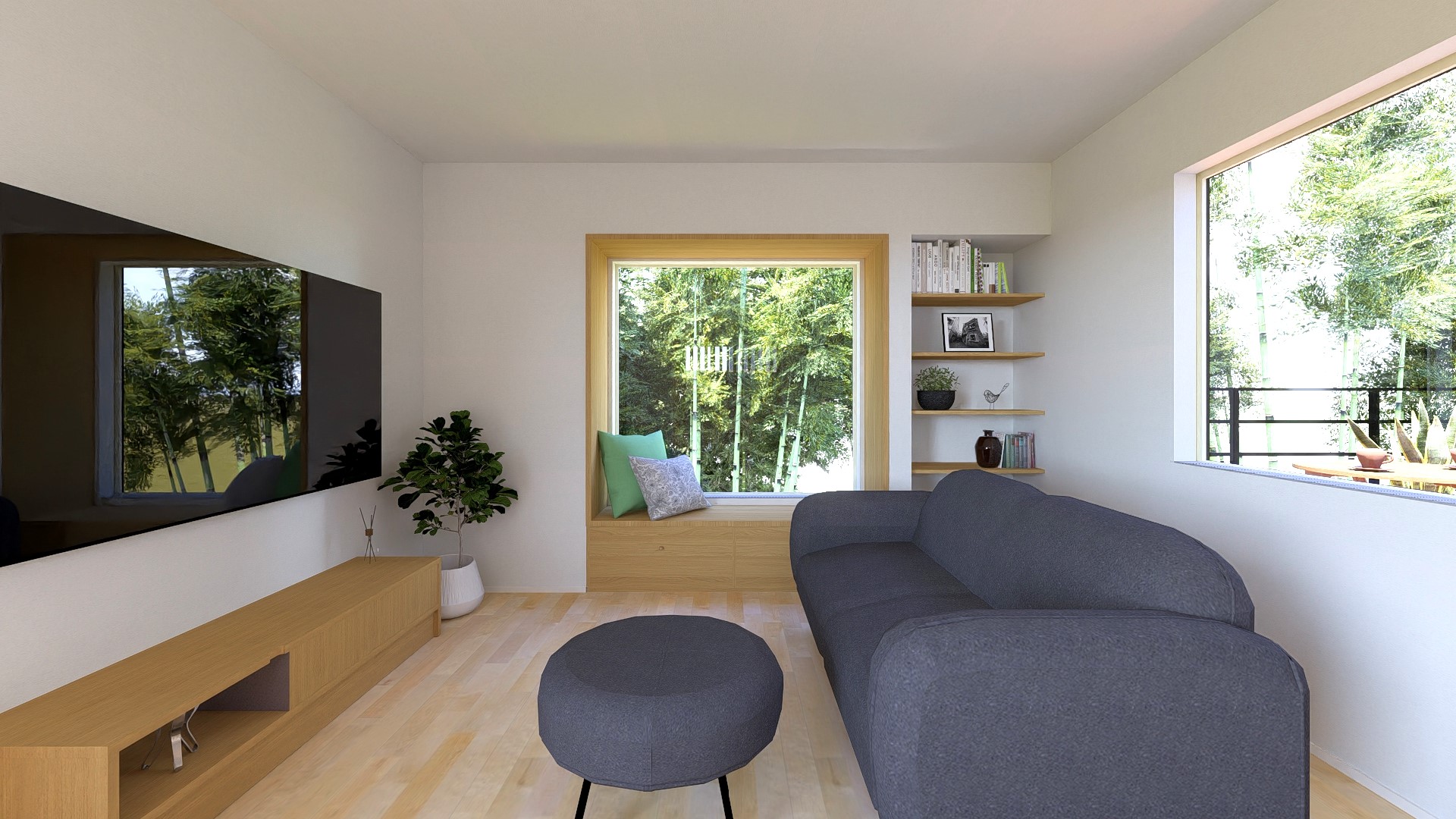 窓から覗く空と2階リビングの木の温もりの調和によって、日々の暮らしを癒す邸。