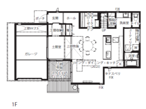 ガレージが土間を介してウッドデッキやLDKと繋がる広々空間によって、