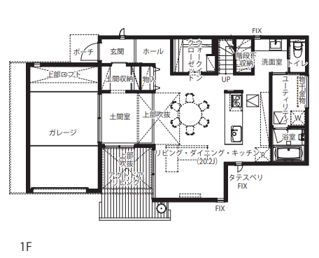 土間室と繋がることで、車の荷物を仮置きしたり、お気に入りの部品を整備したりと、使い方の幅が広がります。後方の物置スペース上にはロフトもあり、収納力バツグンです。